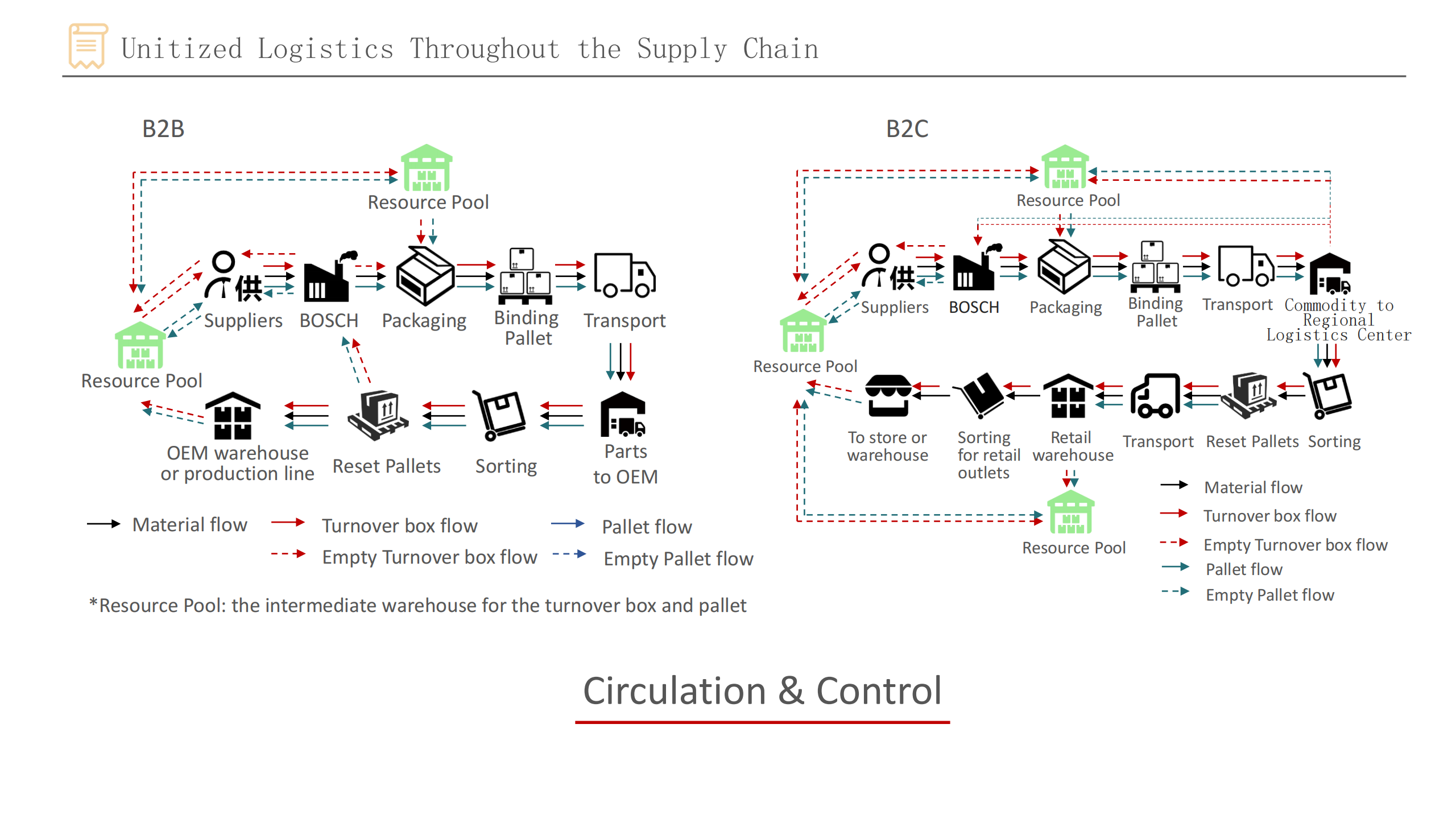 Below is the main process of manufacturing supply chain based on IoT recirculation model and cascade mode, unitized logistics for turnover box, pallet and truck.