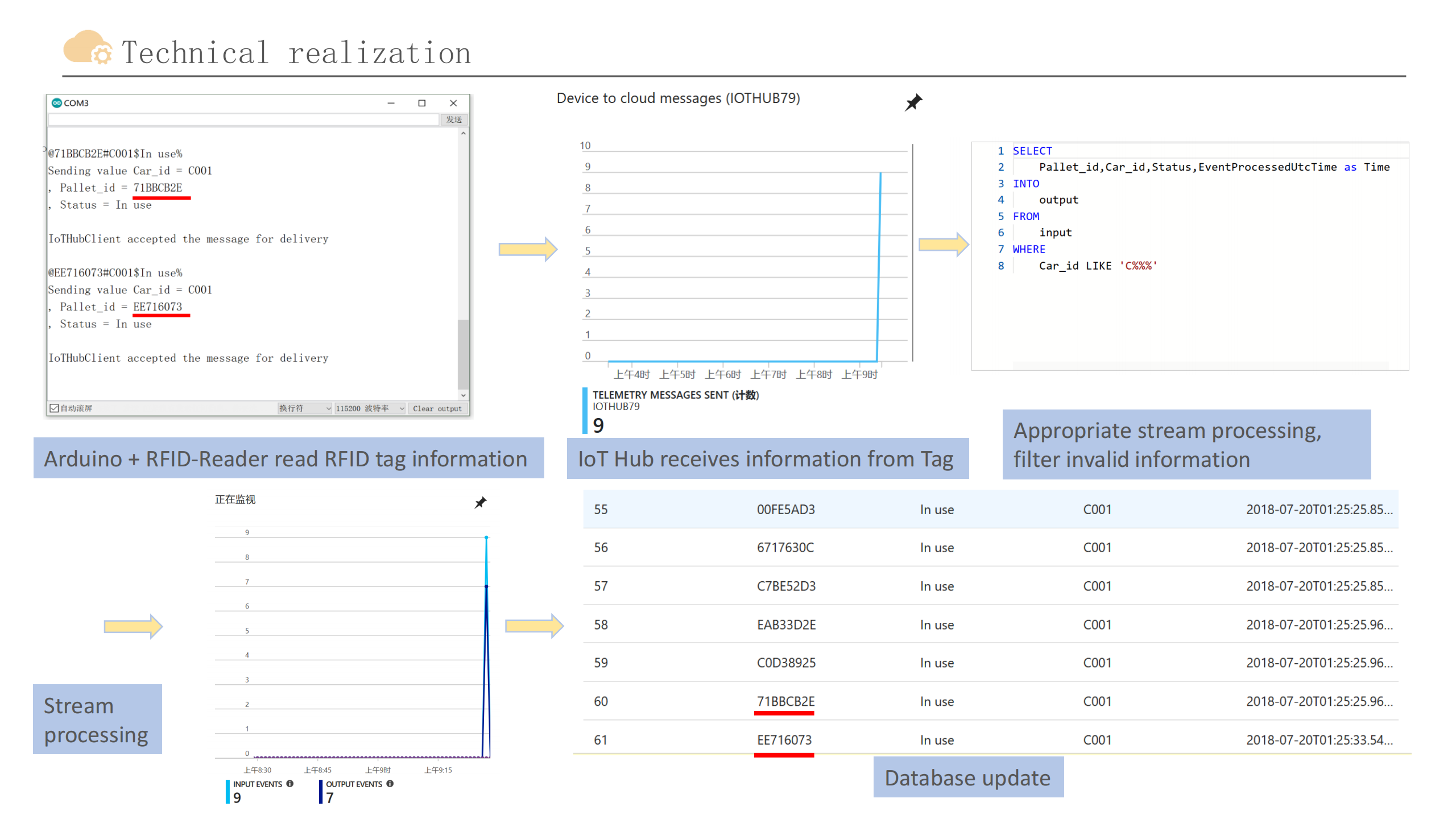 - Through Arduino, NodeMCU upload environment, geography and other information to Microsoft IoThub, then use stream processing transform the information to Azure sqldatabase for real-time monitoring, decision-making, transportation planning and so on.